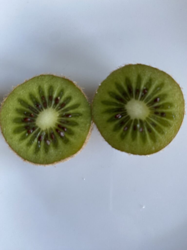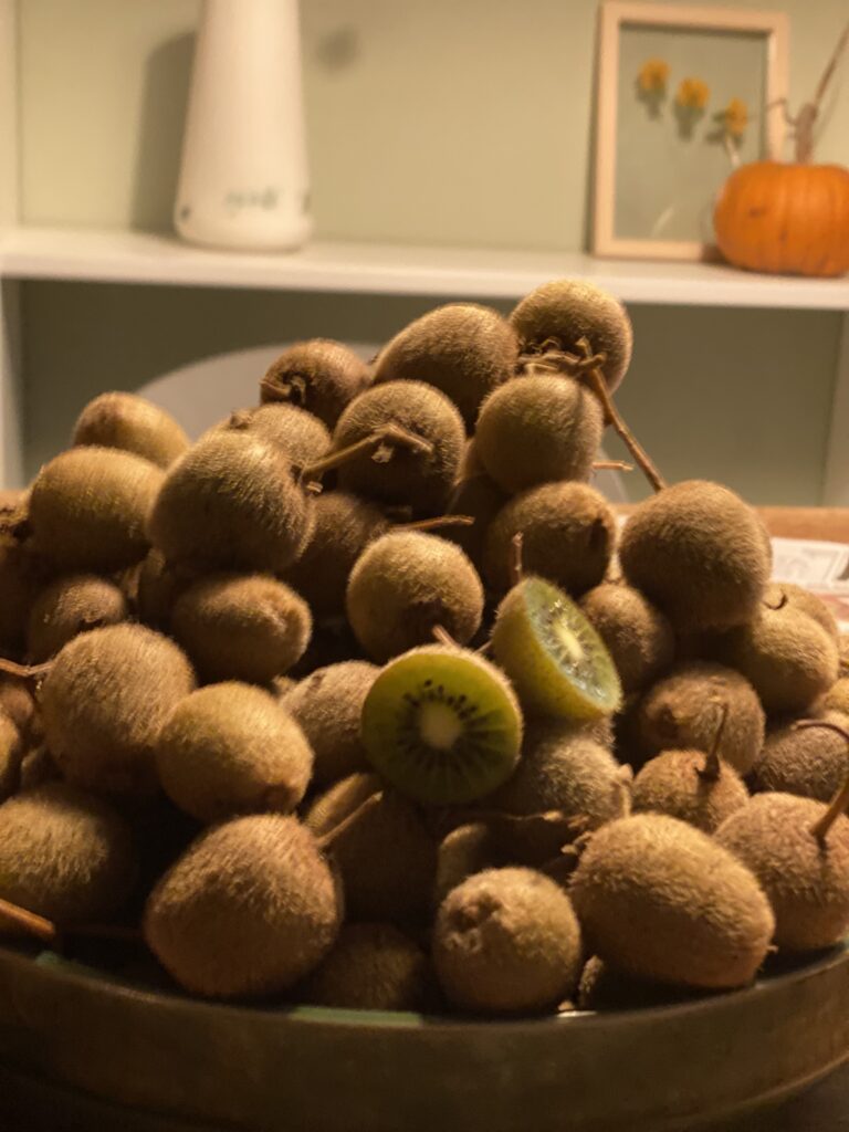 Later ontdekten we pas dat de oogsttijd voor kiwi’s veel later is dan van ander fruit in onze tuin. Vanaf november is het oogsttijd. De kiwi’s zijn dan al wat zachter. Geplukt rijpen ze nog verder.